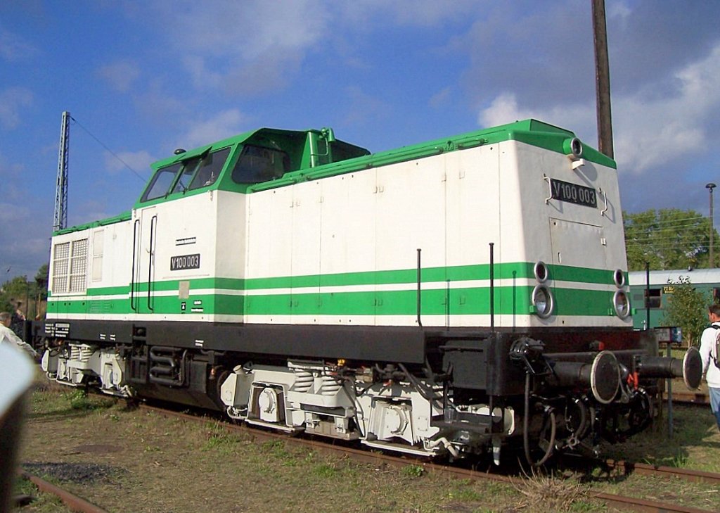 Auch der Prototyp der DR V100 die bei LEW 1965 gebaute V100 003, die noch immer fahrfähig unterschiedliche Aufgaben übernimmt wird vom Förderverein der Berlin-Anhaltische Eisenbahn e.V. betreut war anläßlich der 100 Jahr Feier dabei beim Tag der offenen Tür im Bombardier Werk Hennigsdorf.