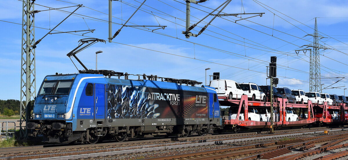 LTE Logistik und Transport GmbH, Graz [A] mit ihrer "186 945" [NVR-Nummer: 91 80 6186 945-2 D-LTE] und einem KLV-Zug Richtung Frankfurt/Oder weiter nach Polen am 03.05.25 Höhe Bahnhof Schönefeld b. Berlin.