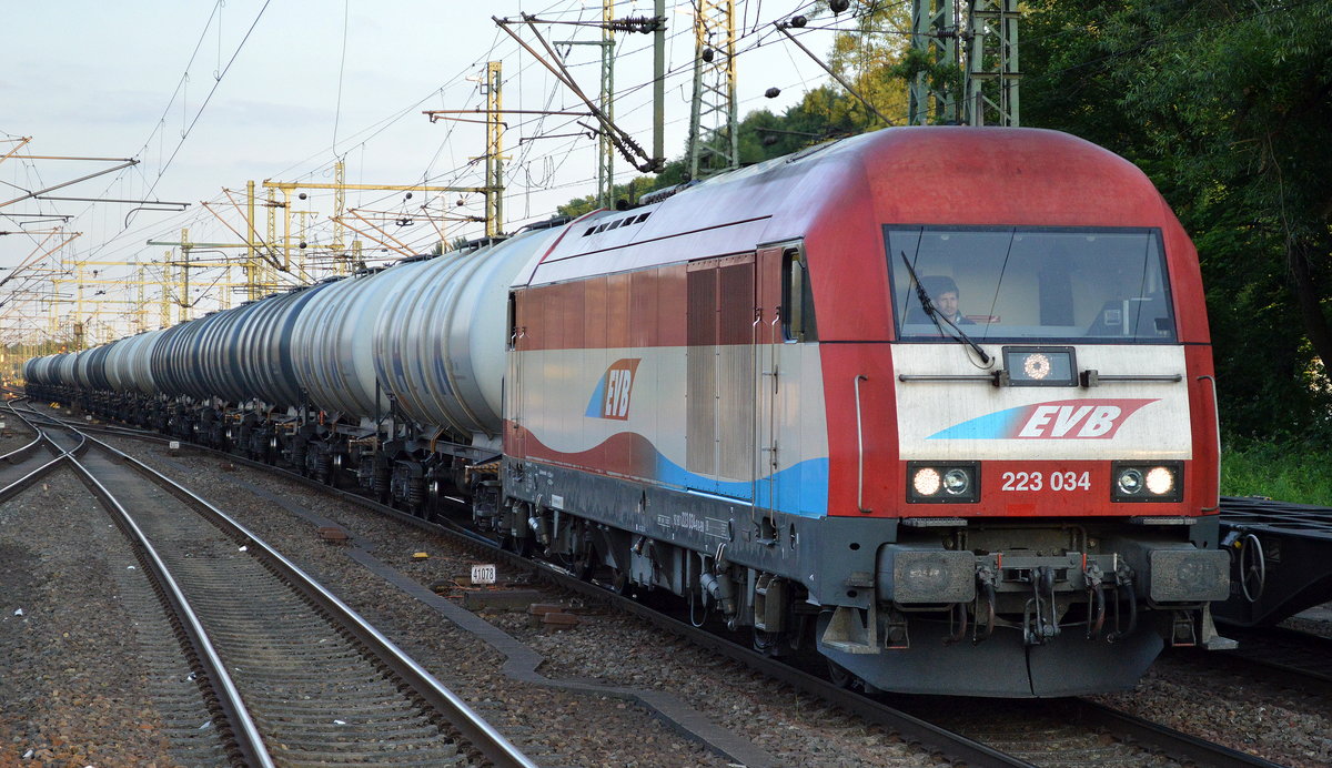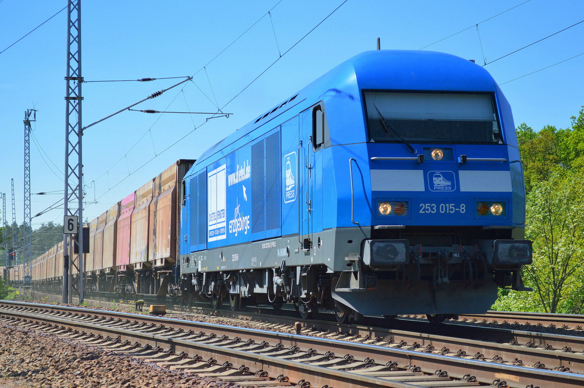 Zum späten Nachmittag noch die schöne PRESS 253 014-9 (223 051-4) mit einem Schüttgut-Containerzug (leer) für Holzhackschnitzel bei der Durchfahrt Bf. Flughafen Berlin-Schönefeld, 28.03.17