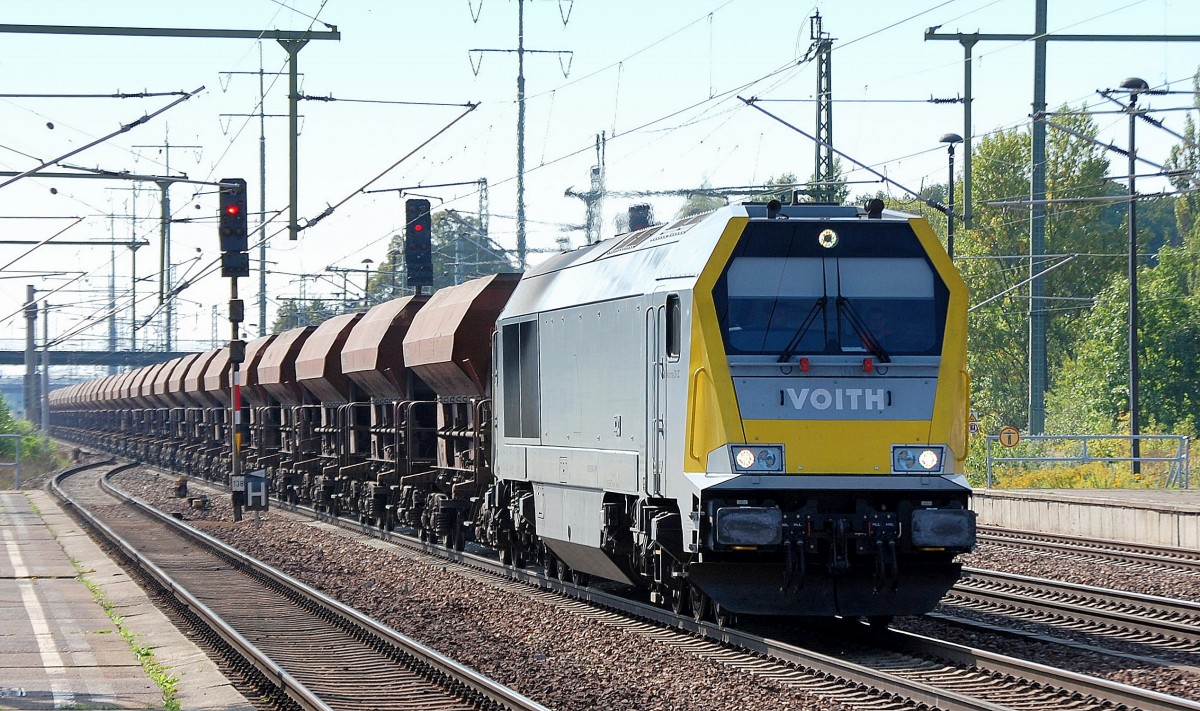 Noch mal aus der Nähe, die VOITH MAXIMA 30 CC 263 004-4 mit Ganzzug Schüttgutwagen am 14.09.1,3 Bhf. Flughafen B erlin-Schönefeld.