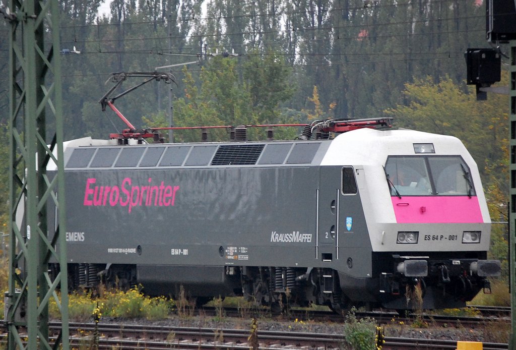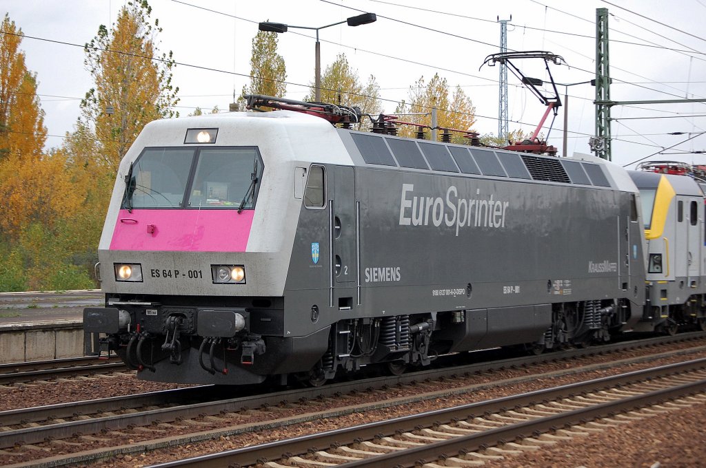 Hier war die MRCE Dispolok der EuroSprinter ES 64 P-001 (91 80 6127 006-6 D-DISPO) noch in der gelben Farbe (2.Farbvariante) unterwegs angekuppelt an einem Lokzug gezogen von TXL ES 64 F4-096 und dazwischen die schwarze ES 64 F4-150 am 04.04.09 im Bhf. Flughafen Berlin-Schönefeld.