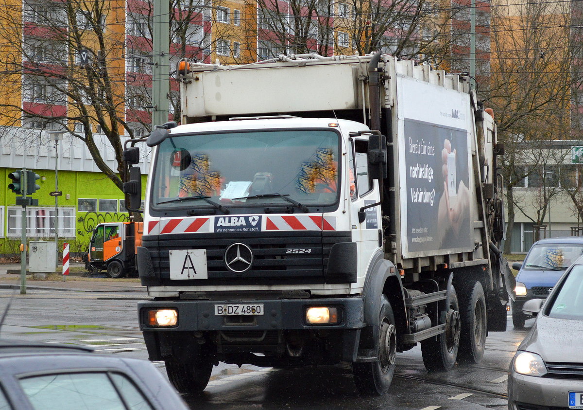 Ein ziemlich betagtes Müllentsorgungsfahrzeug der Fa. ALBA, ein MB 2524 am 22.02.17 Berlin-Marzahn.