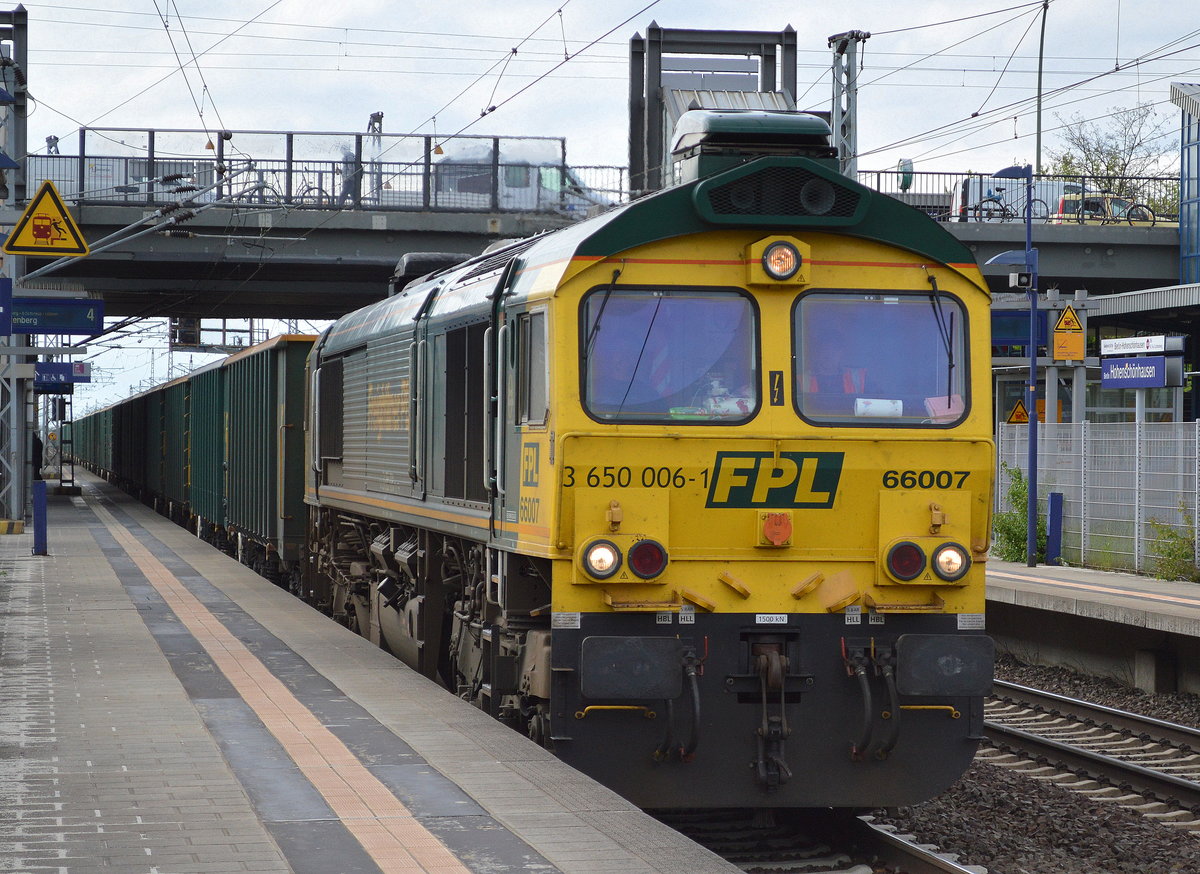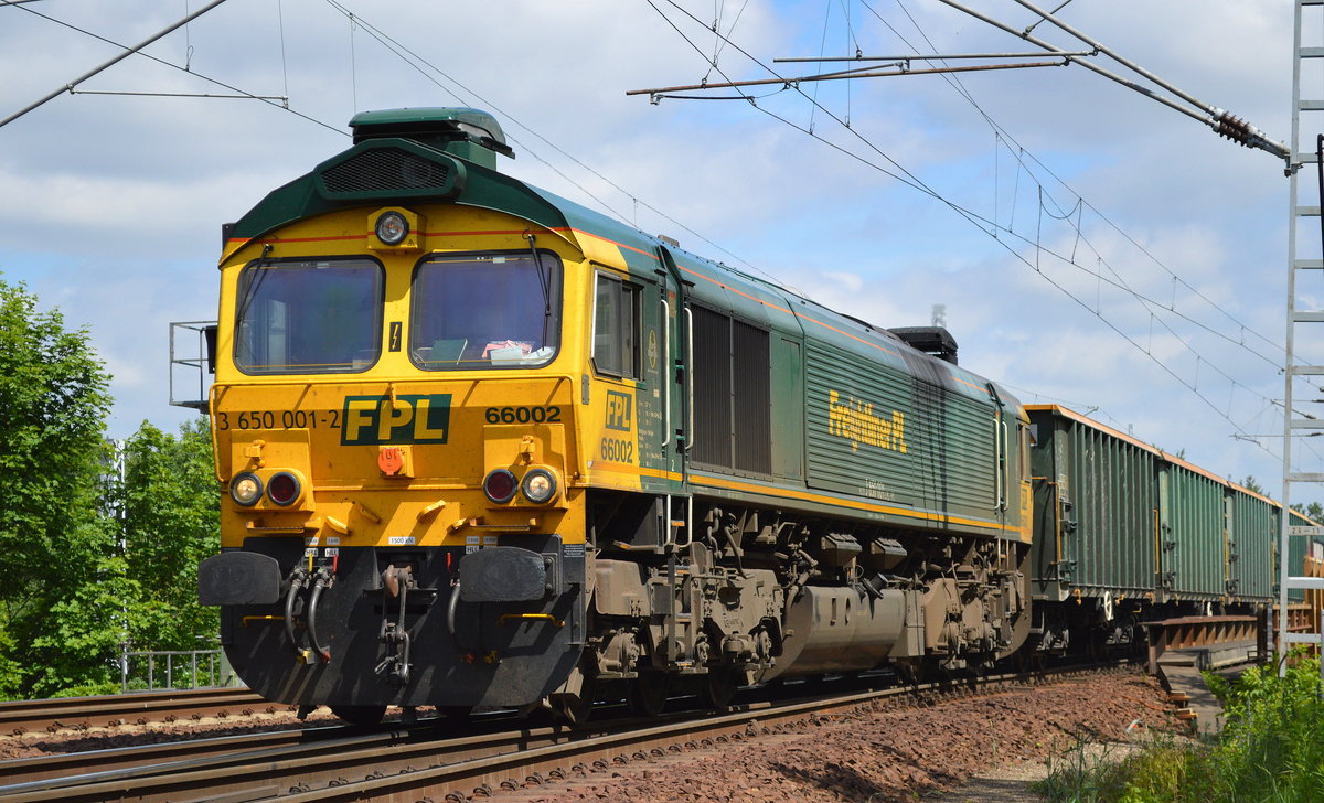 Offener Güterwagen mit der Aufschrift Freightliner mit der Nr. 37 TEN (GE) 80 D-FPL 5840 395-7 Eamnos in einem Ganzzug gleichartiger Wagen am 13.07.16 Bf. Flughafen Berlin-Schönefeld.