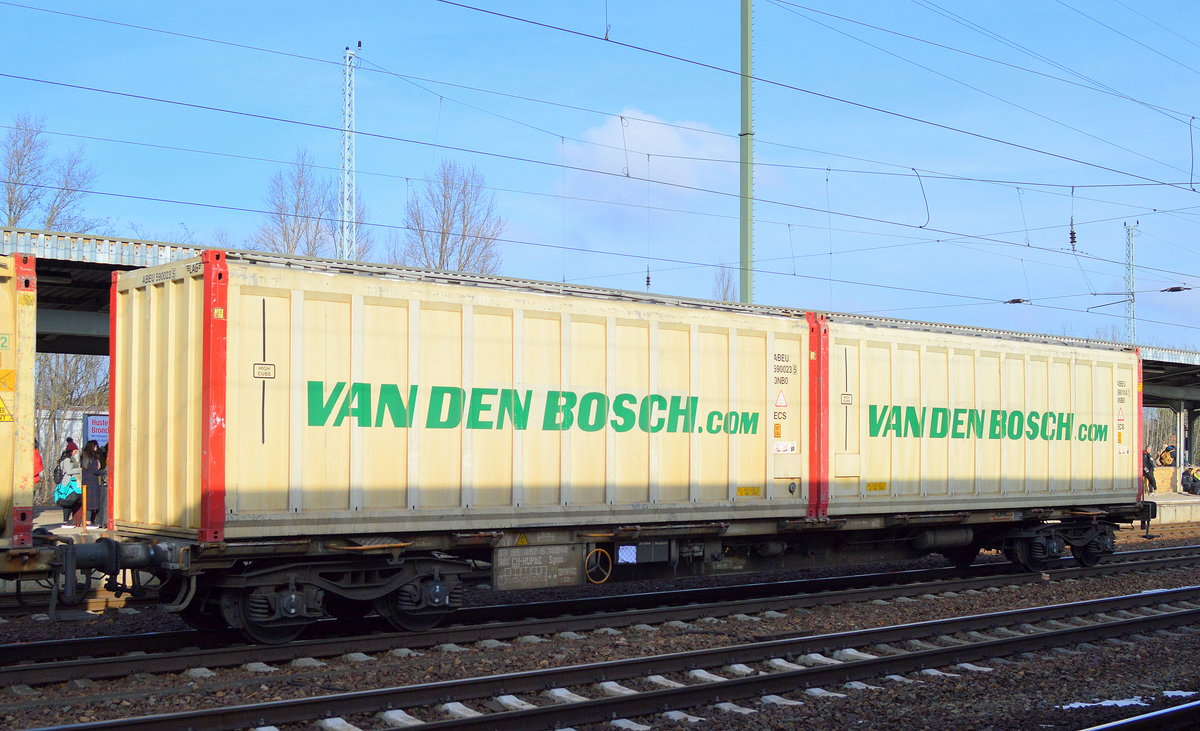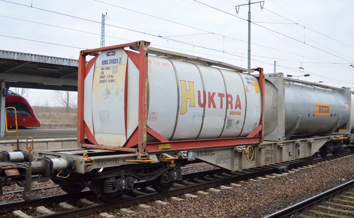 Ein schweizer Containertragwagen vom Einsteller HUPAC mit der Nr. 33 RIV 85 CH-HUPAC 4576 500-4 Sgnss beladen mit zwei 40’ Standard Containern von UBC/InterBulk Group am 06.08.17 Berliner Außenring Höhe Berlin-Wartenberg.
