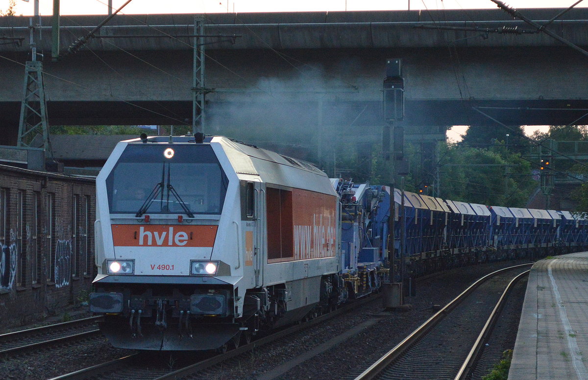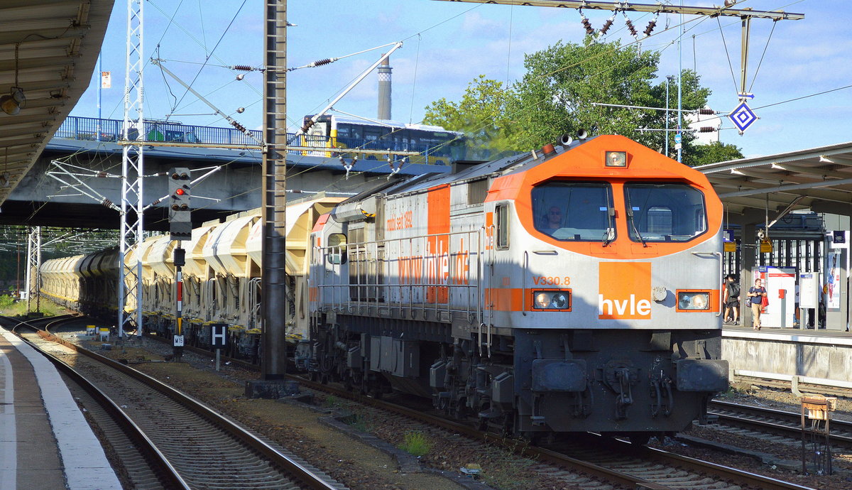 Containertragwagen mit dem Förderband des Schüttgutförderbandzuges der hvle mit der Nr. ?ß RIV 80 D-HVLE 4557 998-4 Sgns 60´am 19.06.17 Bf. Hamburg-Harburg.