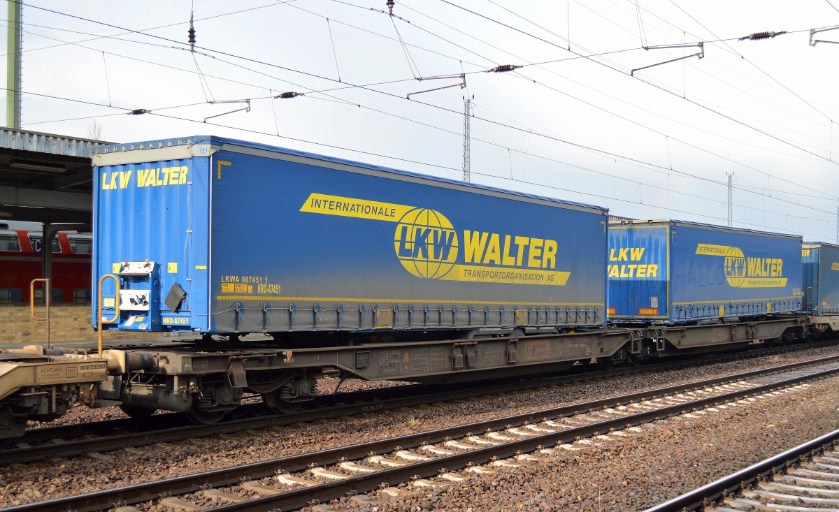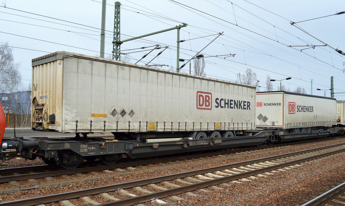 Gelenk-Taschenwagen vom Einsteller Kombiverkehr Dt.Ges. für komb. Güterverkehr GmbH mit der Nr. 37 TEN 80 D-KOMBI 4956 095-6 Sdggmrss beladen mit zwei transped Trailern der österreichischen Transped Holding GmbH am 12.06.17 Bf. Flughafen Berlin-Schönefeld.