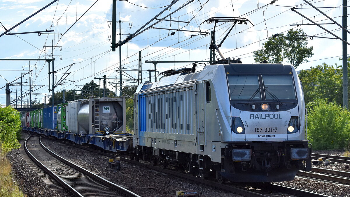 HSL Logistik GmbH, Hamburg [D] mit der geleasten Railpool Lok "187 313-2" [NVR-Nummer: 91 80 6187 313-2 D-Rpool] und einem Kesselwagenzug am 13.11.25 Höhe Bahnhof Frankfurt/Oder.