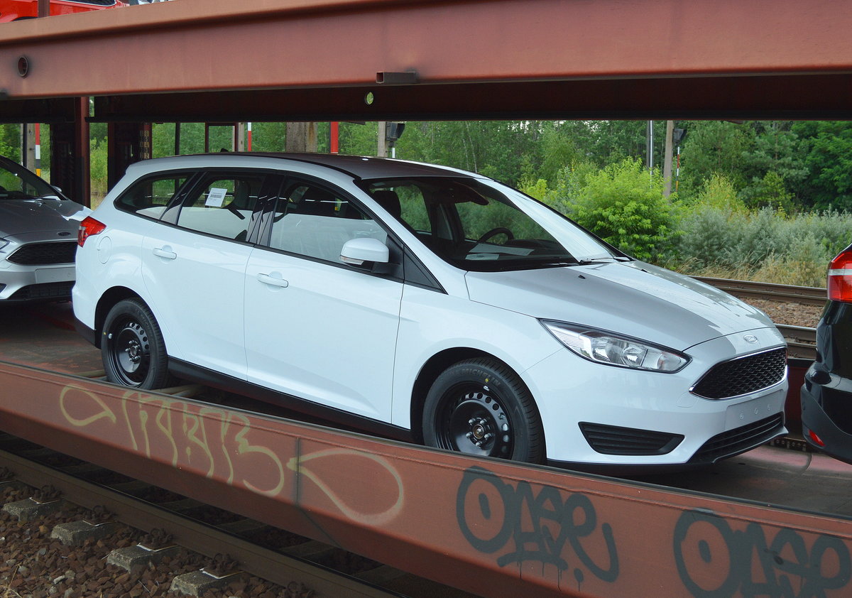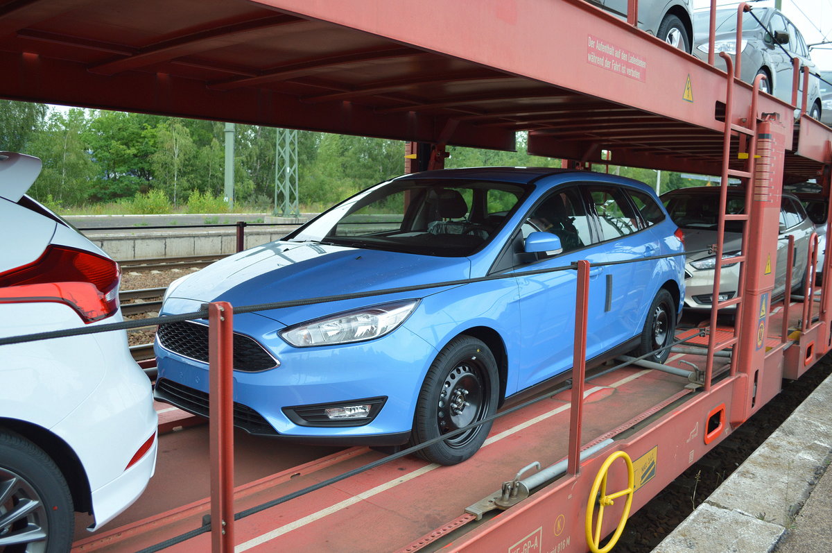 189 015-1 zog diesen recht kurzen PKW-Transportzug mit FORD PKW-Modellen, irgenwie entstand aus diesem Blickwinkel eine reizvolle Optik mit diesem einen blauen Fahrzeug, einem fabrikneuen Ford Focus RS am Ende des Zuges, 25.05.16 Berlin-Hirschgarten.