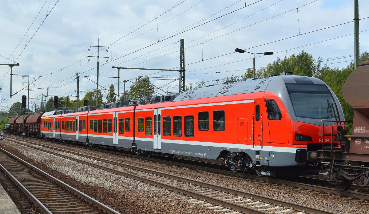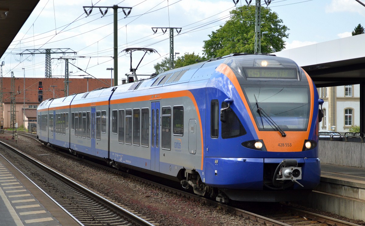 Sicherlich farblich eine der farbigsten Varianten in Deutschland, die Betriebsfarben der Westfalenbahn GmbH Triebzüge, hier nun also eine weitere Überführung eines vierteiligen FLIRT ab Stadler-Werk Berlin-Pankow, der Triebzug 94 80 1428 603-3 D-WFB ...., am 07.04.15 Berlin-Karow