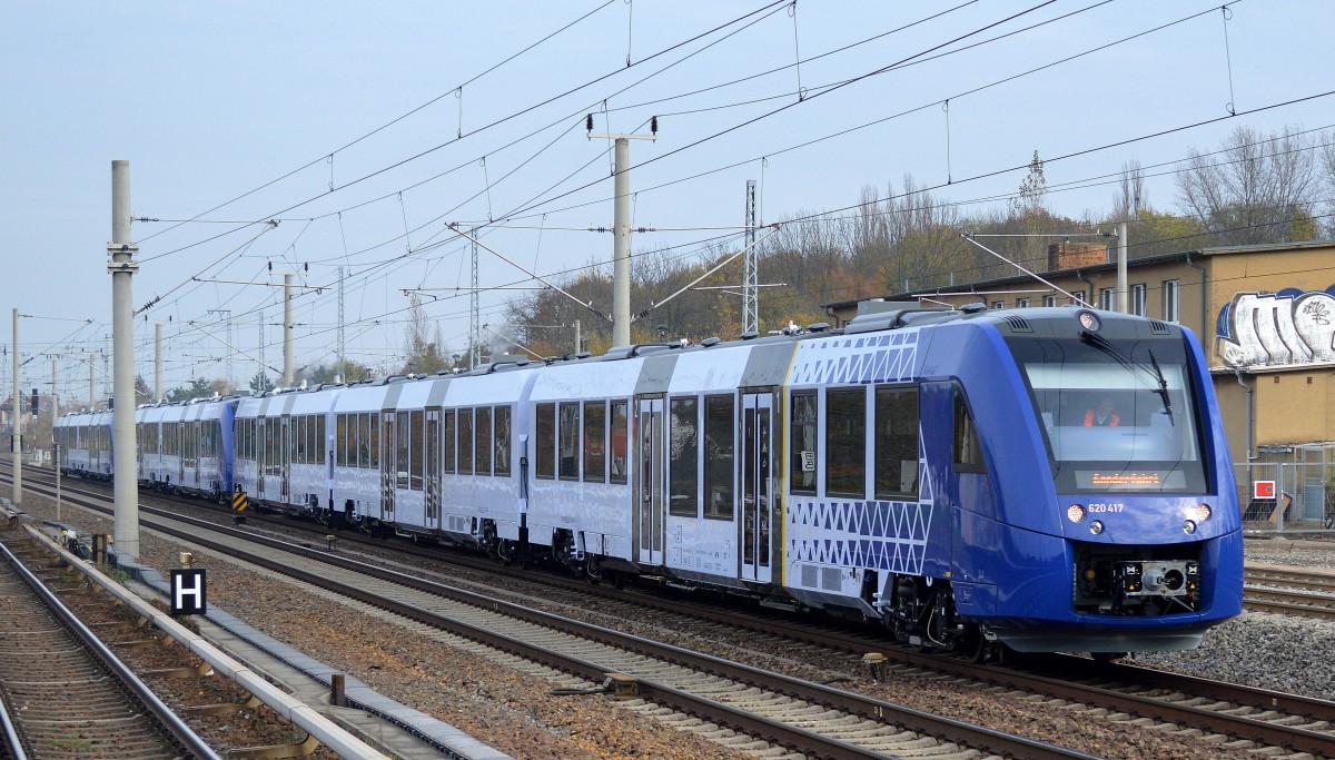 Alstom präsentiert den inzwischen in Deutschland regional schon in verschiedenen Regionen erfolgreich eingesetzten Dieseltriebzug LINT 54, hier einer für die Landesverkehrsgesellschaft Niedersachesn (LNVG) mit der Nr. 622 208 (95 80 0622 208-6 D-LNVG) am 26.09.14 Inno Trans Berlin.