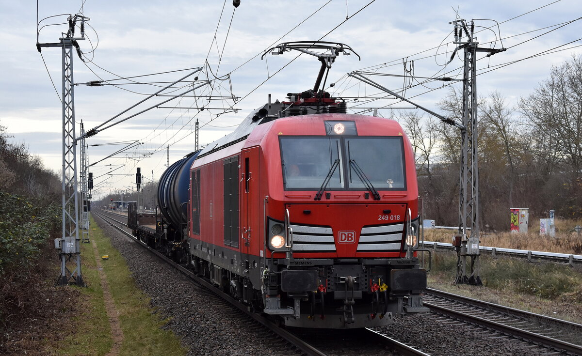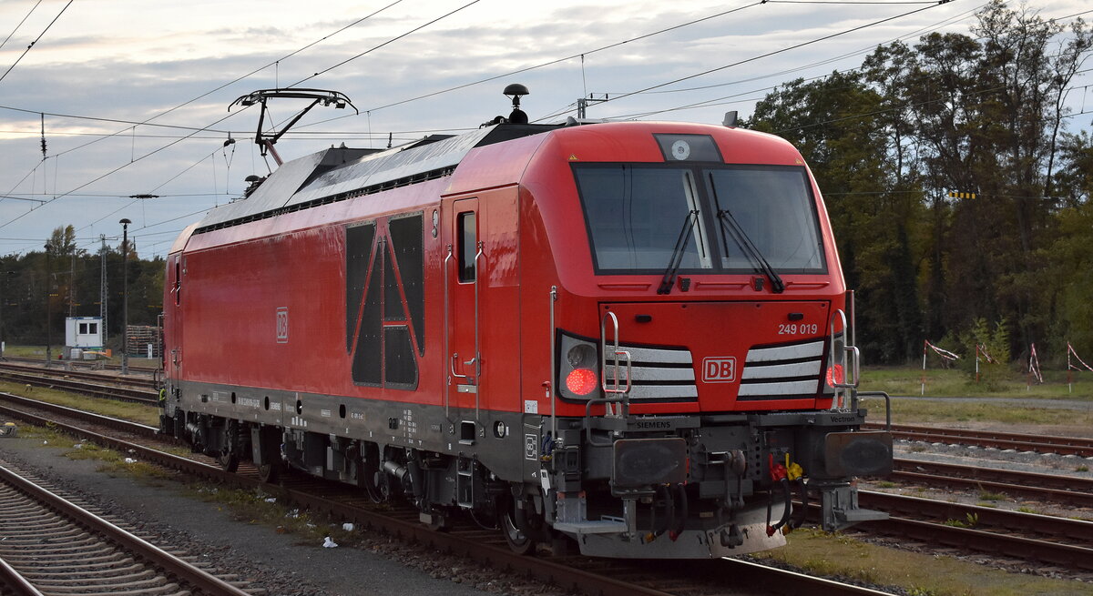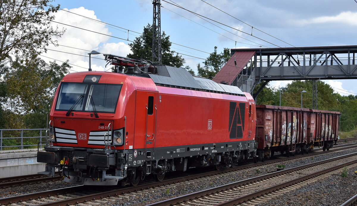 DB Cargo AG, Mainz [D] mit ihrer Vectron Dual Mode Light Lok "249 049" [NVR-Nummer: 90 80 2249 049-8 D-DB] und einem Schotterzug am 30.07.25 Durchfahrt Bahnhof Ruhland.